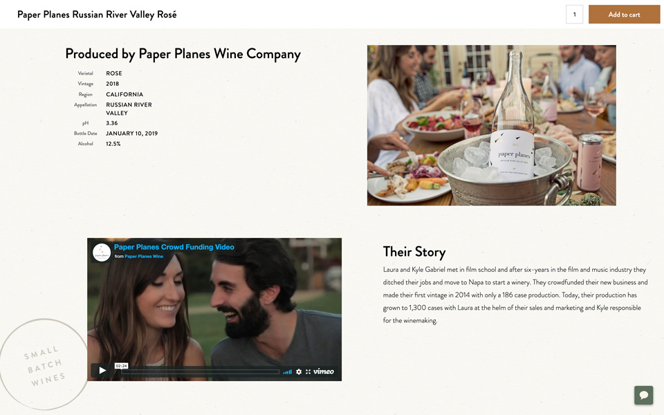 And last but not least, another photo of the producer, barrels, and a short text containing the story behind the winery. A nice detail also is the “Small Batch Wines” stamp watermarked at the left - which surely brings some extra value, making the landing page even more attractive for the customer to complete the purchase.