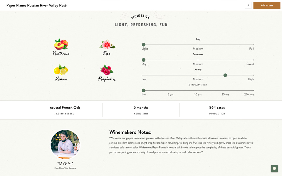 Now let’s take a look at Tasting Merchants product page. Below their product section, they have an additional product info section. Key information, ingredients, and wine attributes are very well presented in an interactive and visually appealing way – the user gets a real overview of the wine they're shopping for, leaving no blanks left in their mind. There’s also a picture of the winemaker giving info and thoughts on the production process - which brings some extra trust to the customer.