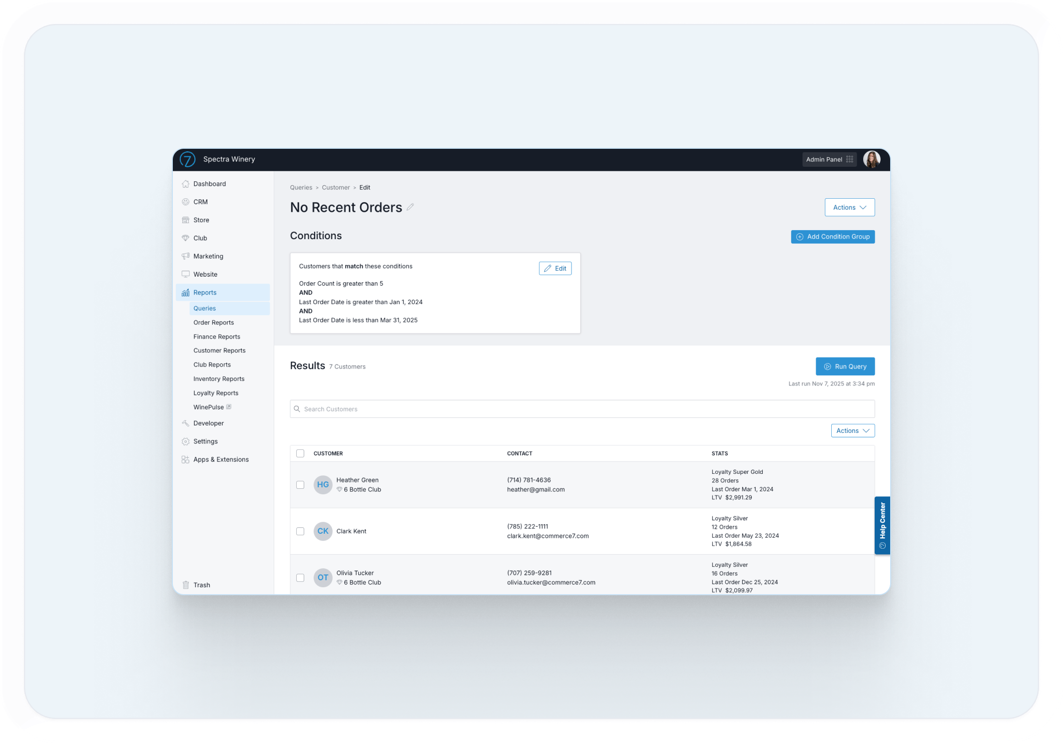 Commerce7’s CRM is built specifically for selling wine direct-to-consumer, whole most CRMs are designed for wholesale or generic sales pipelines. Ours is designed to understand wine customers. It connects purchase behaviour, lifetime value, club activity, and custom attributes in one place so wineries can deliver personalized experiences across the tasting room, ecommerce, and wine club, not just manage contacts.