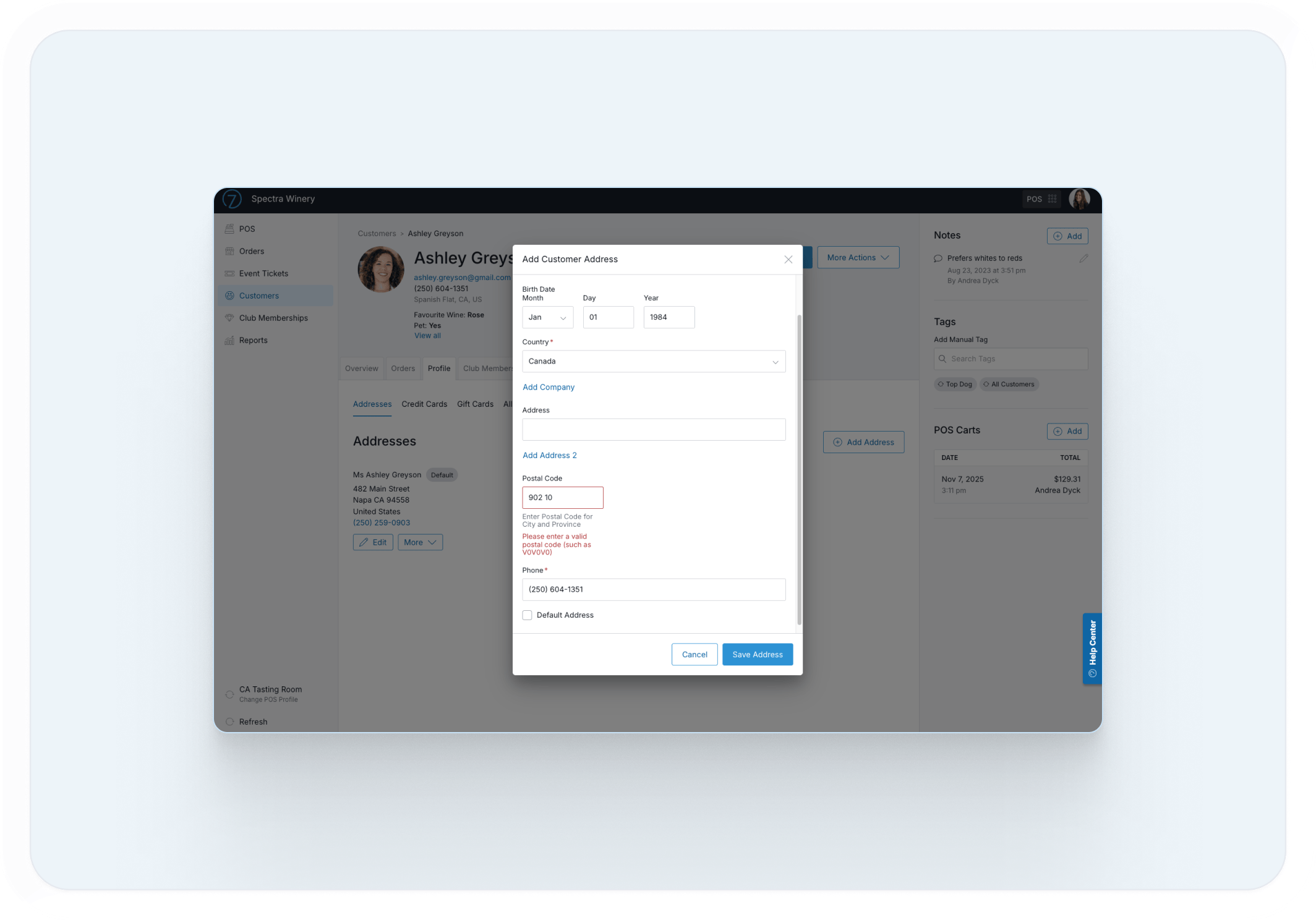 Commerce7 stores past order information, products purchased, reservations booked, customer addresses, credit card information, email, phone numbers, birthdate, LTV, club memberships, emails sent, and any notes/tasks your team may need to optimize customer experience and internal workflows. Custom fields can also be added to collect any type of information desired.